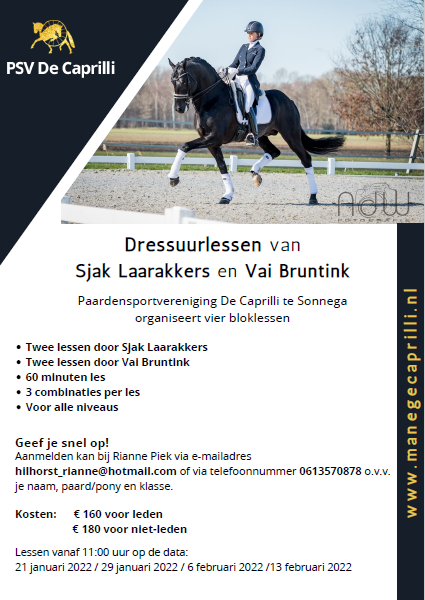 Lees meerPaardensportvereniging De Caprilli te Sonnega organiseert vier bloklessen Twee lessen door Sjak Laarakkers Twee lessen door Vai Bruntink